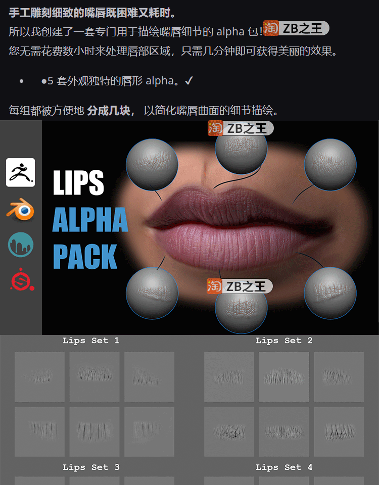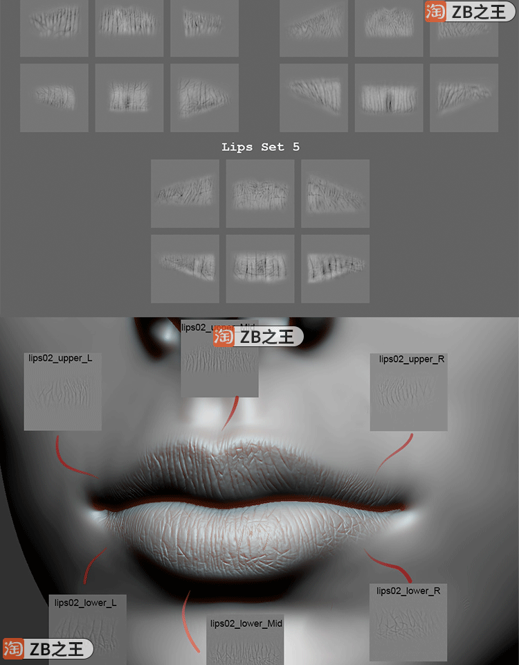 ZBrush素材嘴唇细节唇印alpha笔刷ZB人物角色雕刻TIF/JPG置换贴图