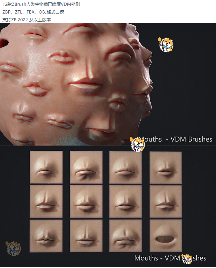 ZBrush笔刷12款人类生物嘴巴嘴唇VDM笔刷ZBP格式ZTL工程FBX/OBJ