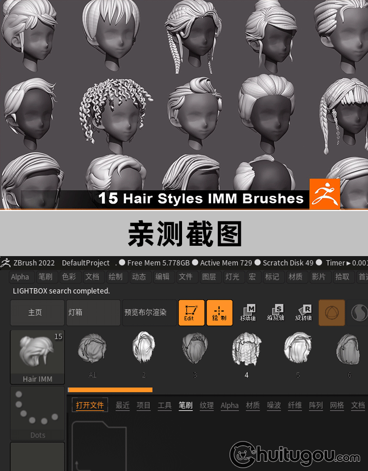 ZBrush卡通头发辫子IMM笔刷zbp画笔3D建模雕刻设计ZTL OBJ素材ZB
