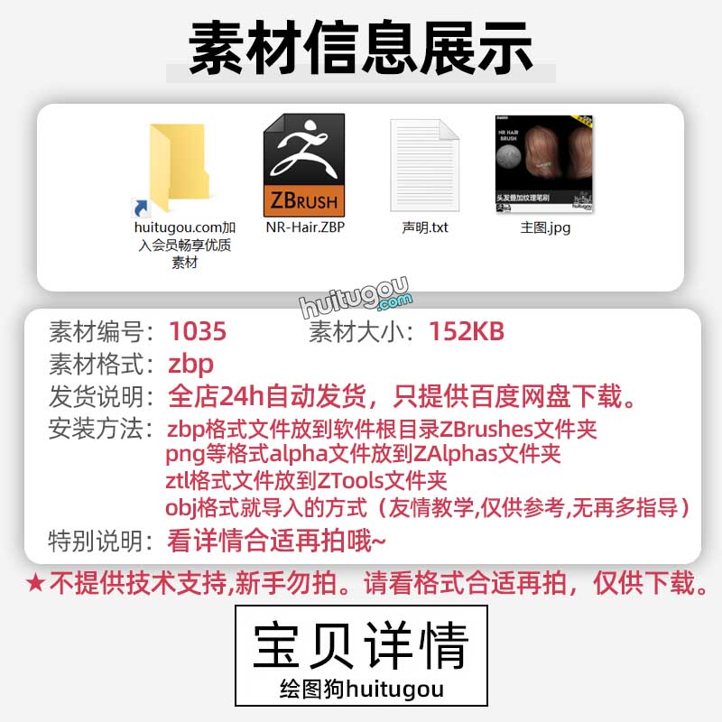 ZBrush毛发长发皮毛纹理zbp笔刷ZB雕刻卡通风格头发叠加纹理画笔