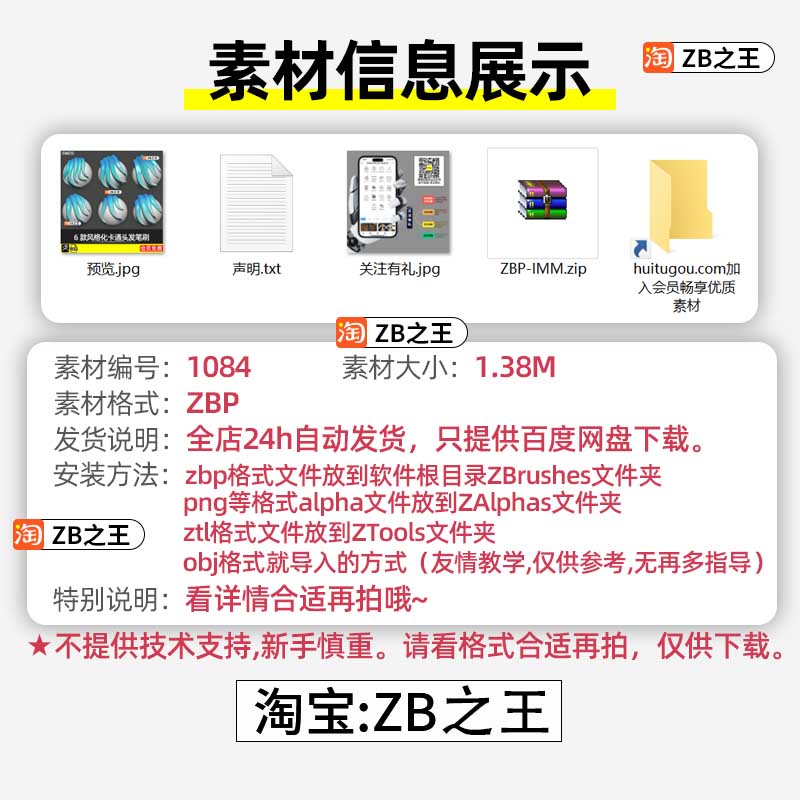 ZBrush毛发长发皮毛纹理zbp笔刷ZB雕刻卡通风格头发叠加纹理画笔