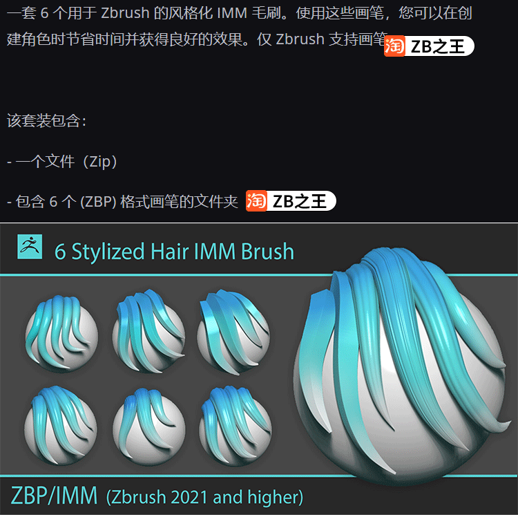 ZBrush笔刷ZB雕刻卡通人物毛发型6款风格化卡通头发IMM笔刷ZBP