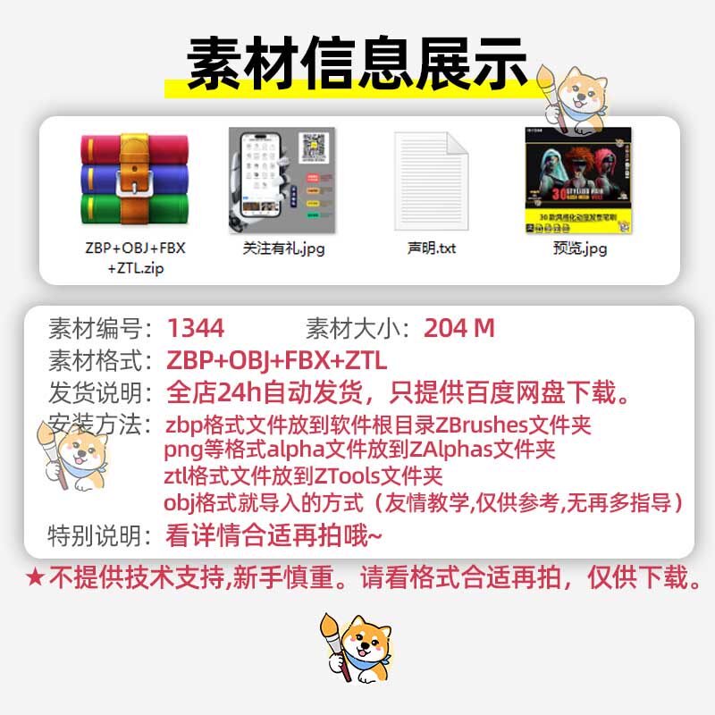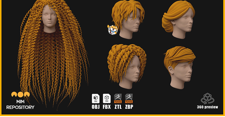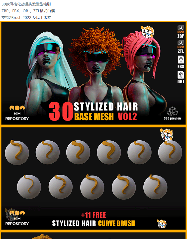 ZBrush笔刷30款风格化动漫头发型ZBP笔刷ZB素材带ZTL工程OBJ模型