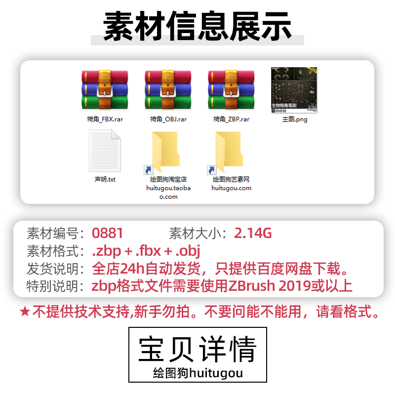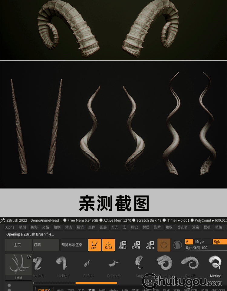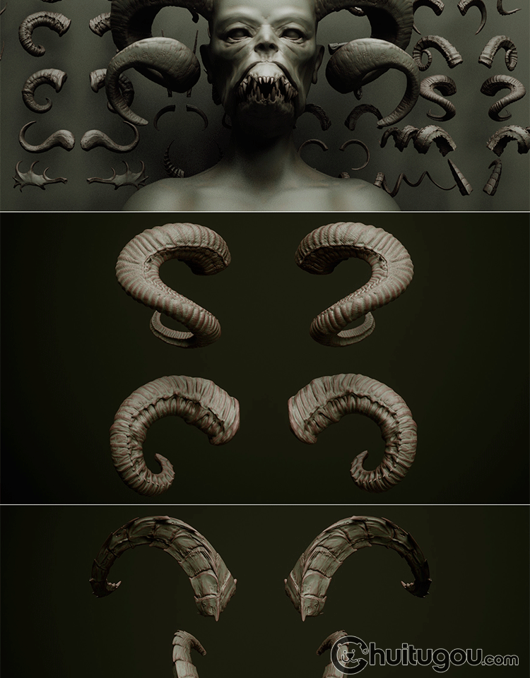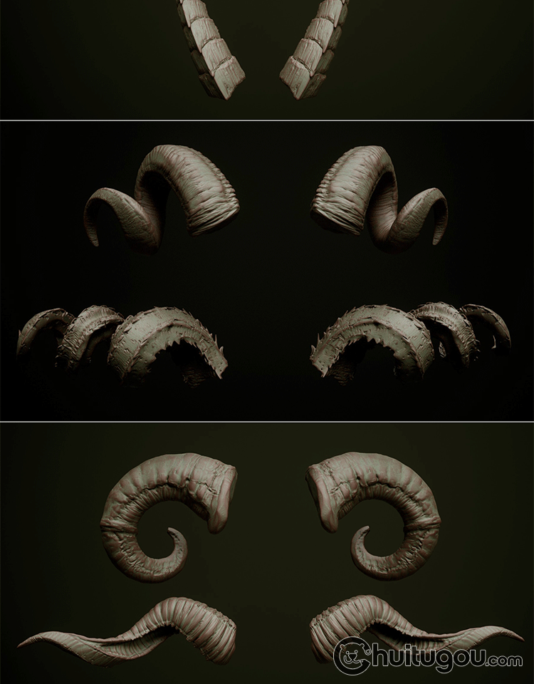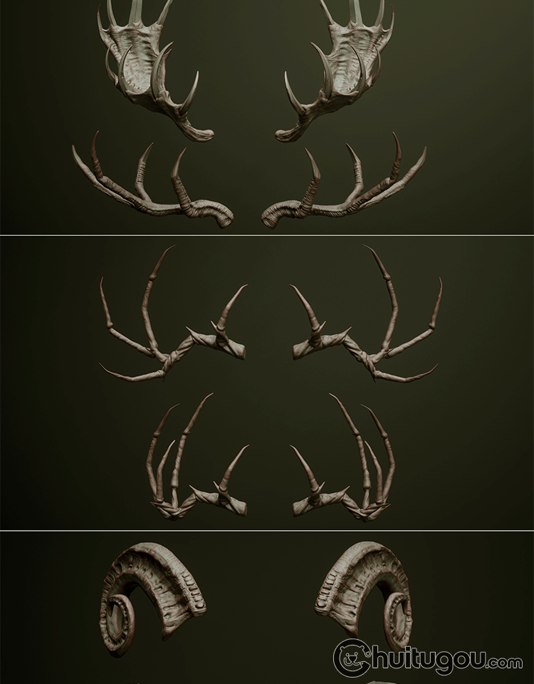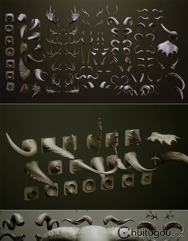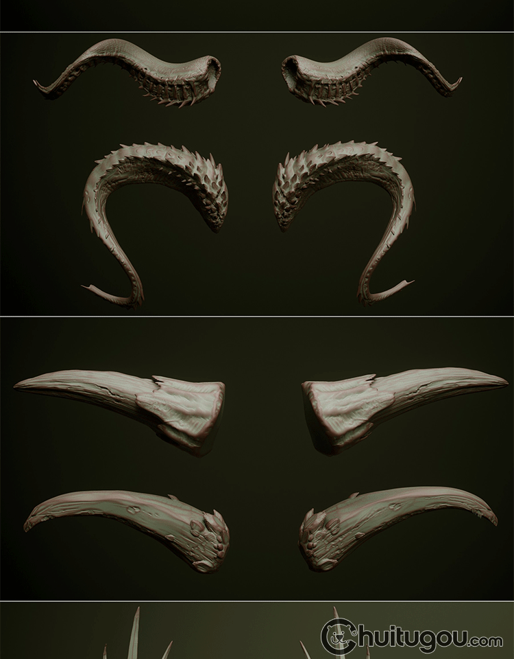 Zbrush兽角动物牛羊角科幻生物犄角笔刷ZB笔刷zbp素材 FBX模型OBJ