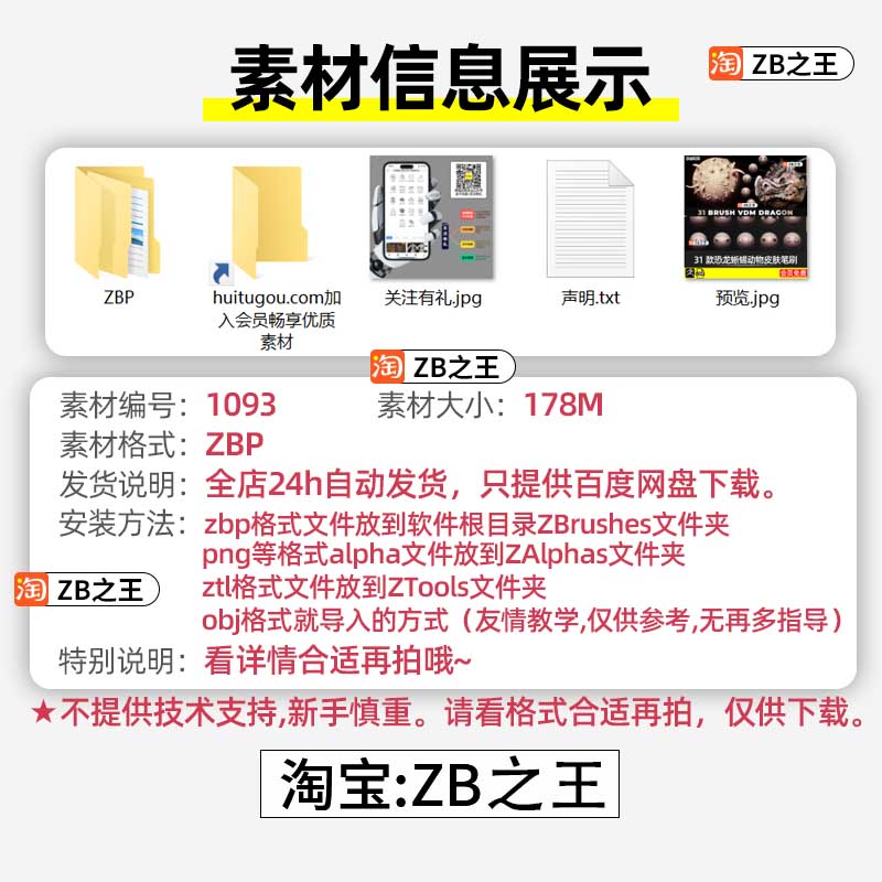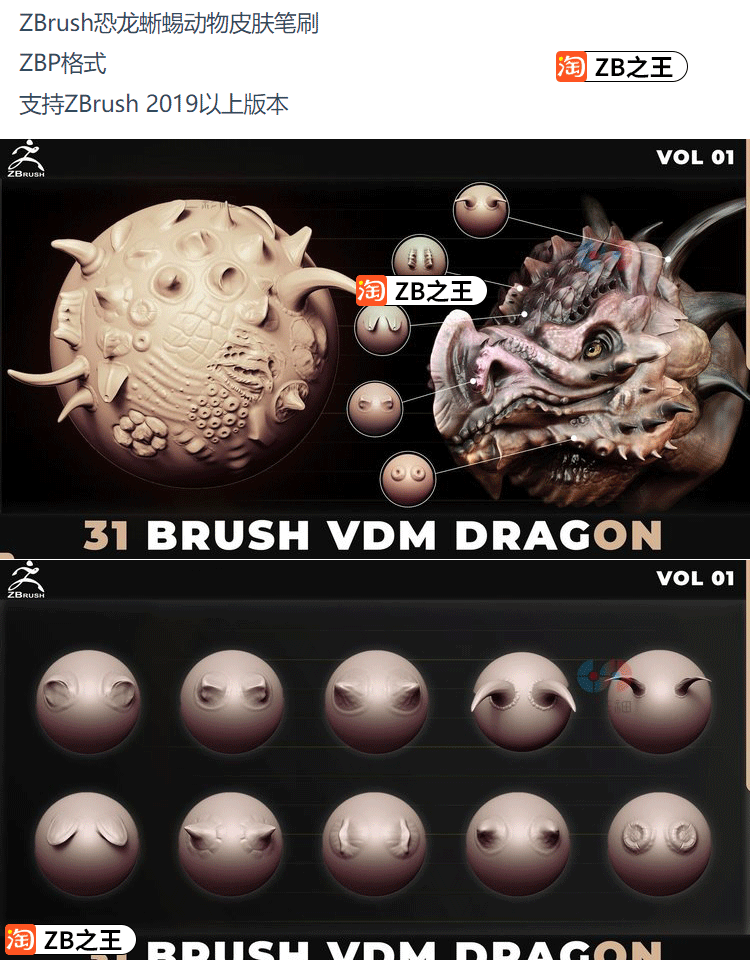 ZBrush素材ZB雕刻恐龙恶龙怪兽30款爬行动物龙鳞皮肤VDM笔刷Alpha