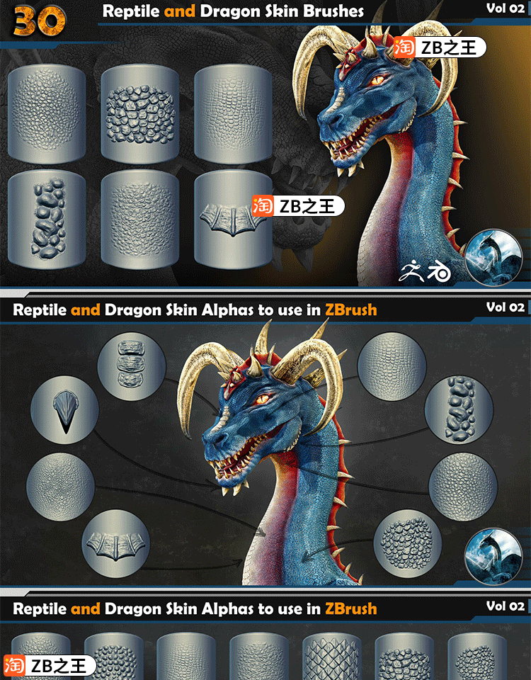 ZBrush素材ZB雕刻恐龙恶龙怪兽30款爬行动物龙鳞皮肤VDM笔刷Alpha