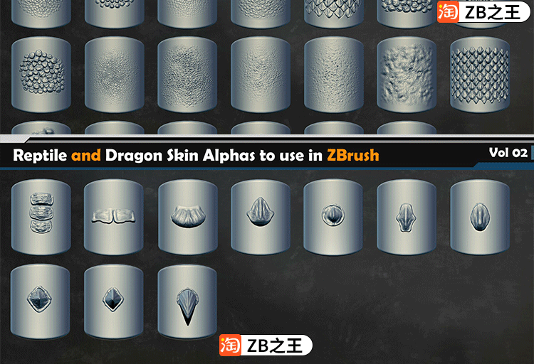 ZBrush笔刷40款爬行动物龙鳞蛇皮肤VDM笔刷ZBP格式Alpha纹理贴图