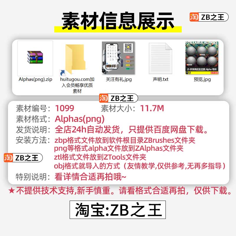 ZBrush皮肤金属木材织物Alpha笔刷皮革岩石毛发ZB雕刻阿尔法纹理