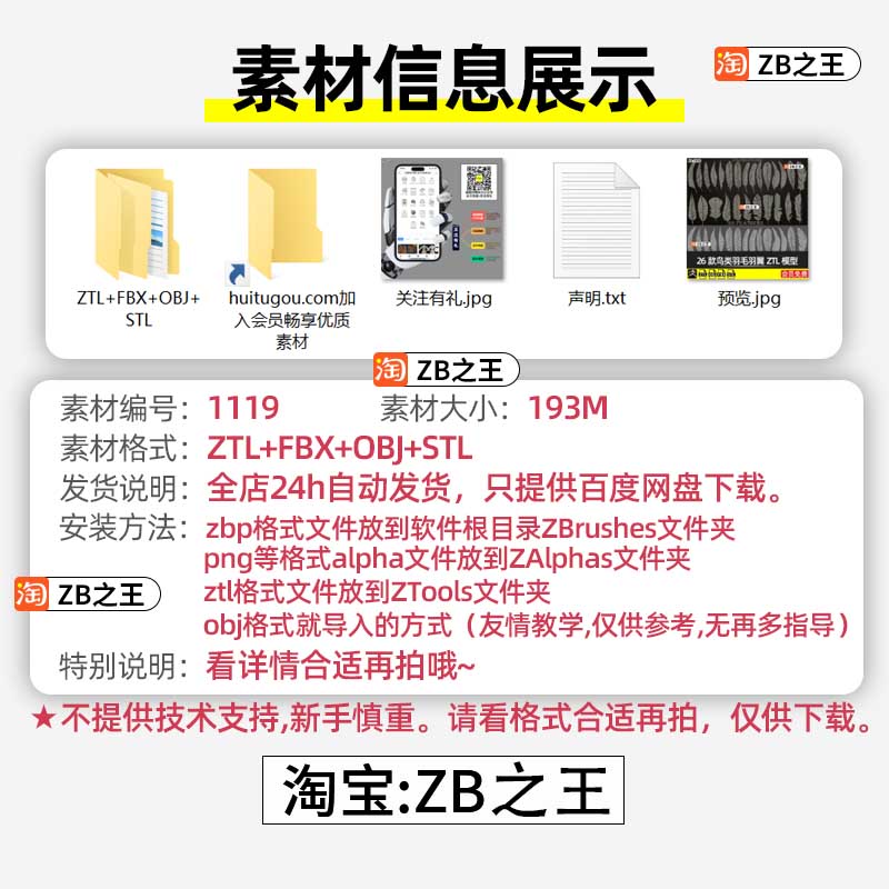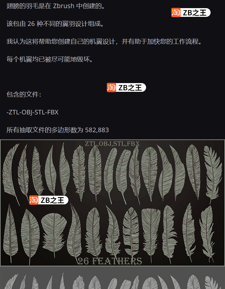ZBrush模型26款鸟类羽毛羽翼ZTL模型FBX格式OBJ素材ZB雕刻鸟儿