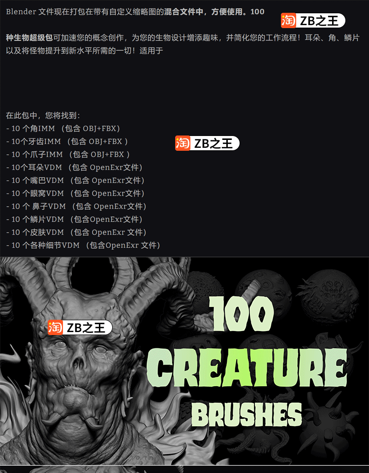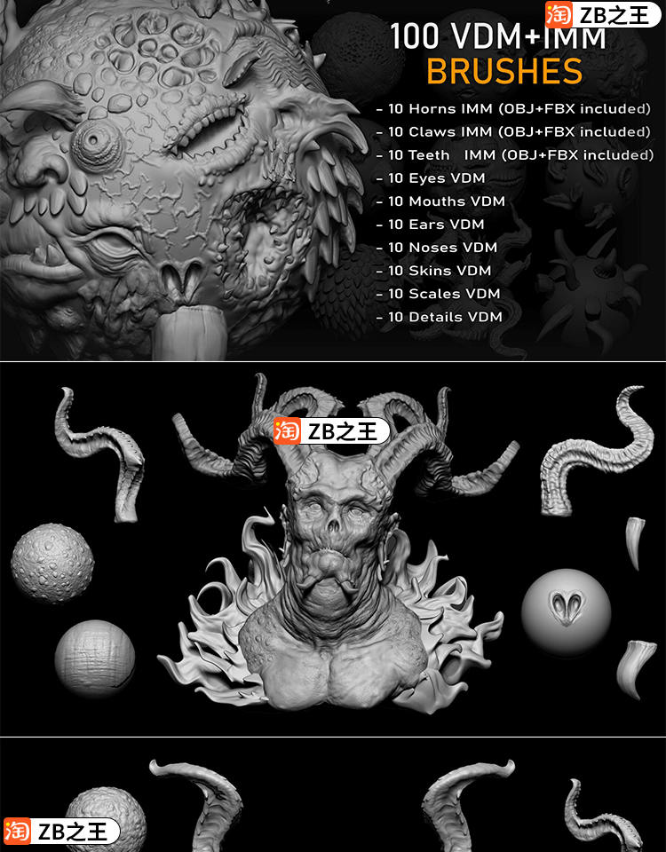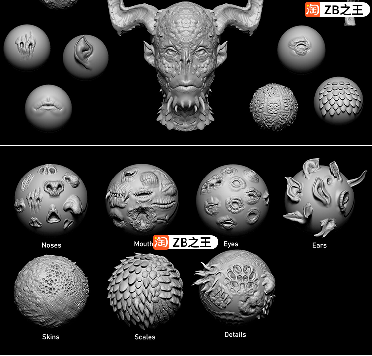 ZBrush笔刷100款怪物生物皮肤zbp附带FBX OBJ模型ZB建模雕刻素材