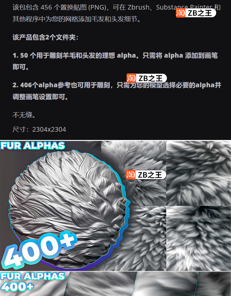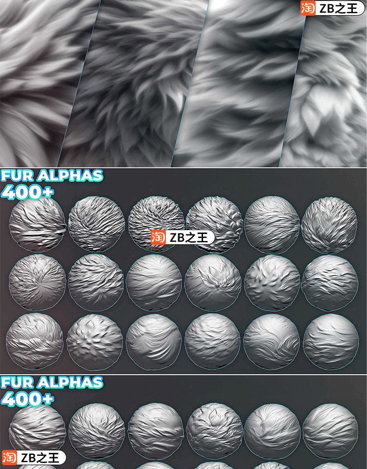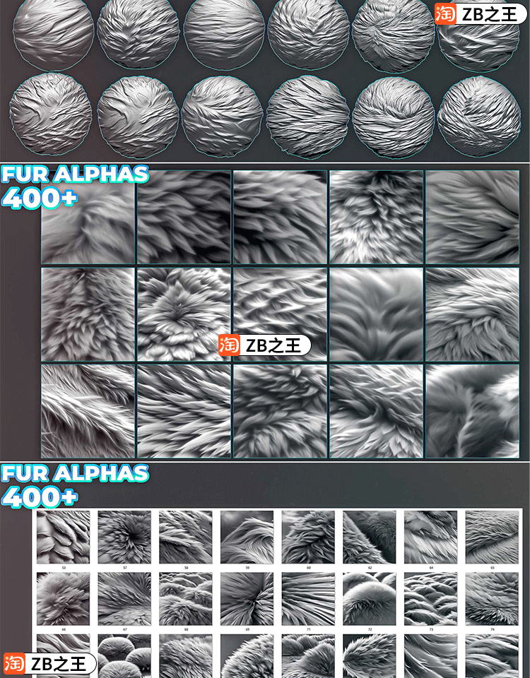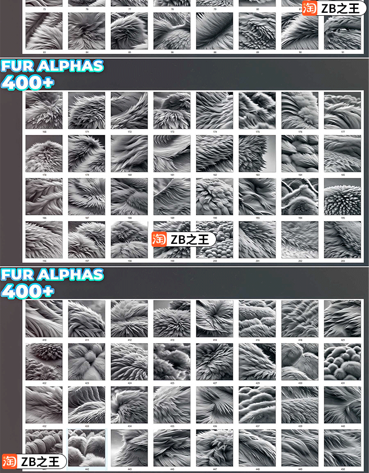 ZBrush素材456款动物生物毛发皮毛绒毛Alpha笔刷png格式纹理贴图