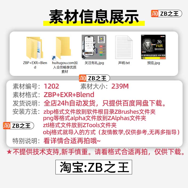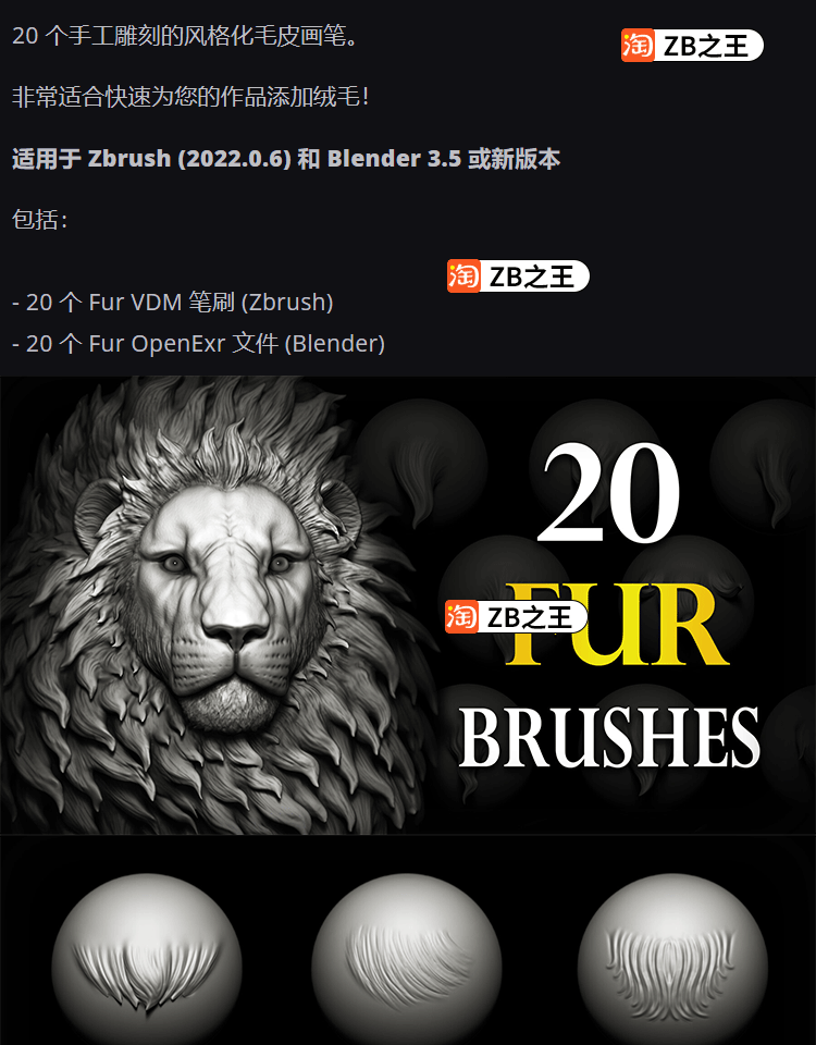 ZBrush笔刷ZB素材20款风格化动物狮子老虎狗毛发皮毛绒毛VDM笔刷