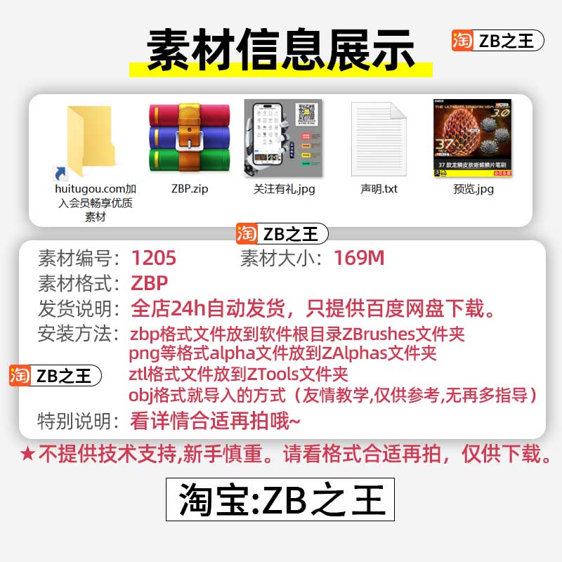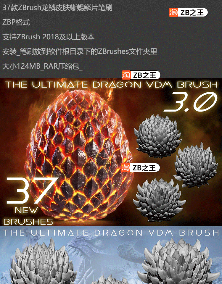 ZBrush笔刷ZB素材37款爬行动物龙鳞皮肤蜥蜴恐龙鳞片硬甲ZBP笔刷
