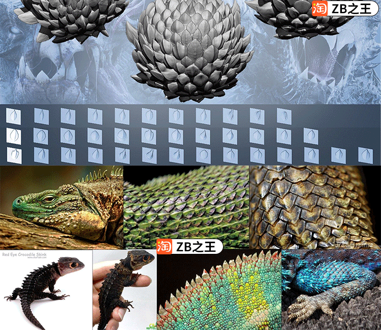 ZBrush笔刷275款爬行动物皮肤龙蛇蜥蜴鳞片Alpha笔刷ZB雕刻素材