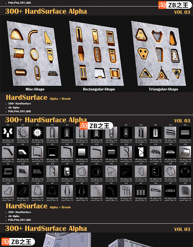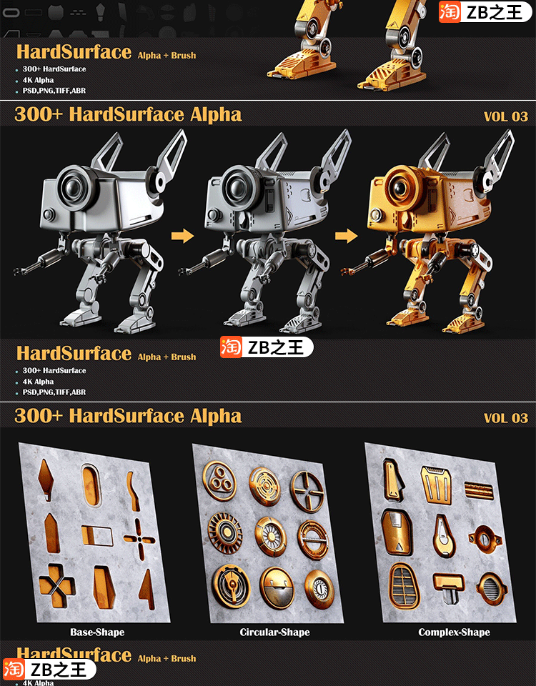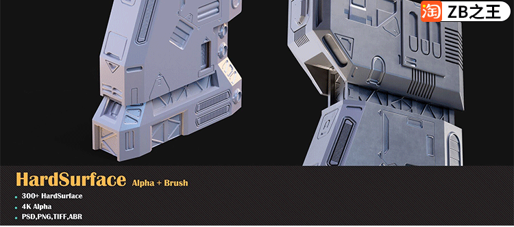 ZBrush雕刻ZBP笔刷390款机械硬表面Alpha笔刷JPG贴图纹理PSD ABR