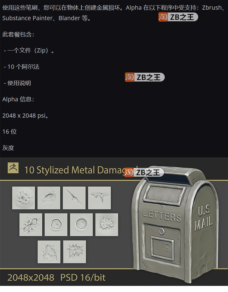 ZBrush素材10款风格化金属破损损坏alpha笔刷PSD格式贴图ZB可用SP