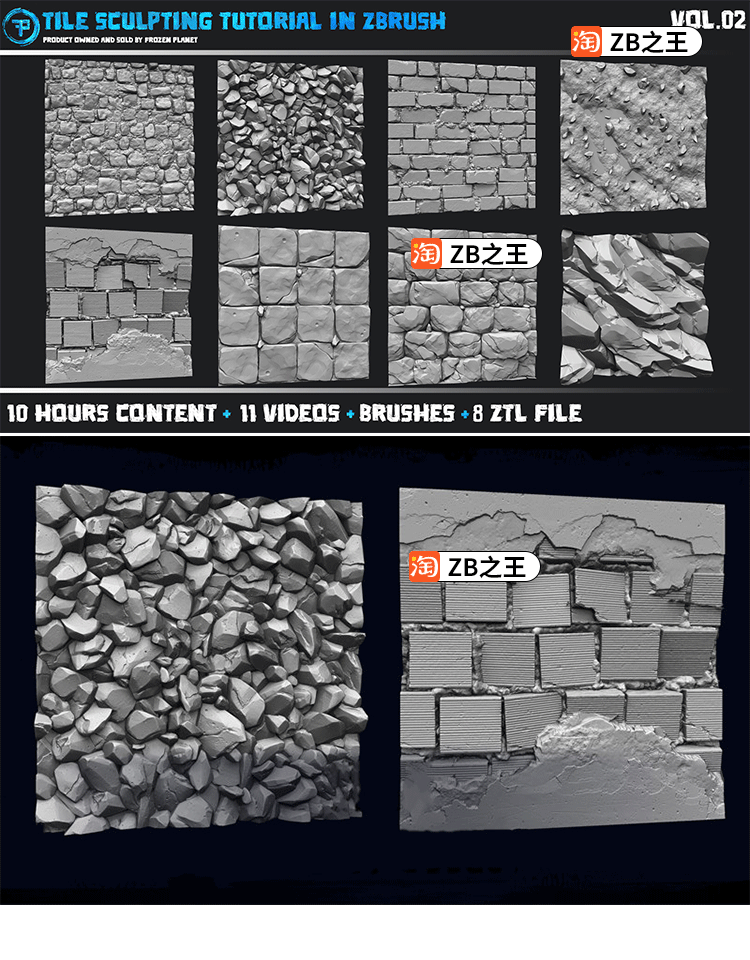 ZBrush笔刷8款石头墙壁破旧墙面地面ZB笔刷ZTL模型3D建模雕刻素材