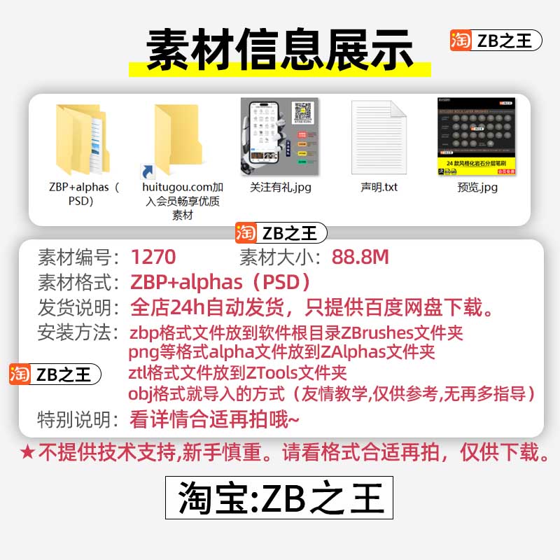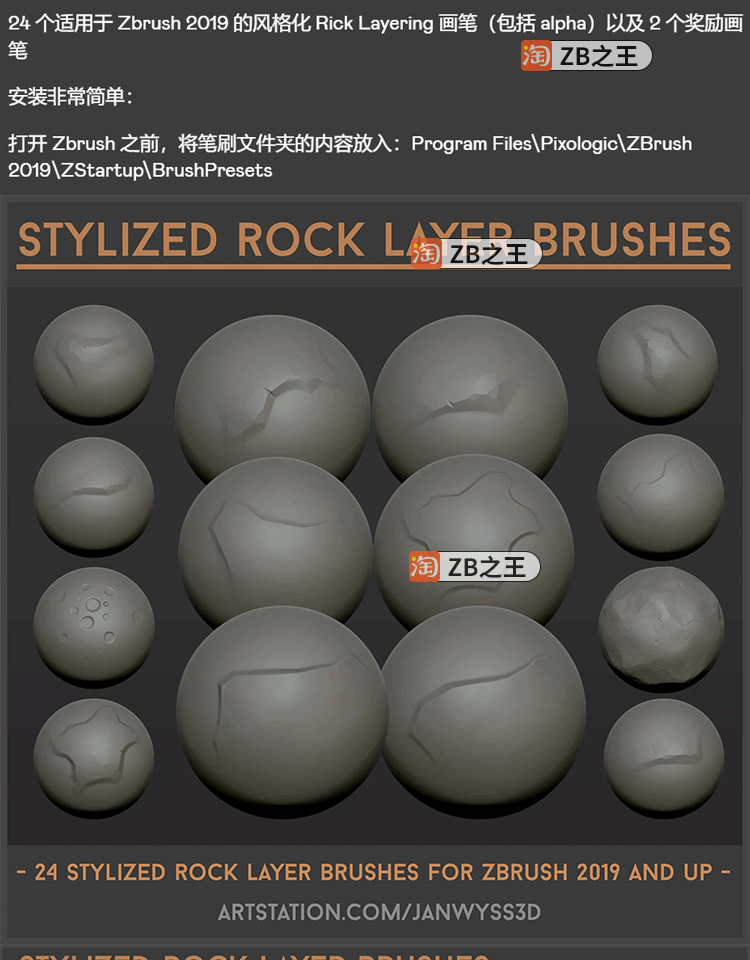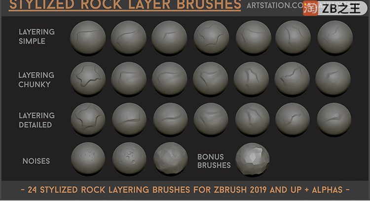 ZBrush素材24款风格化岩石分层ZBP笔刷带PSD格式Alpha贴图ZB雕刻