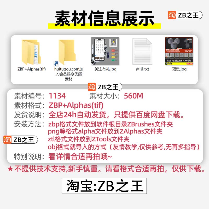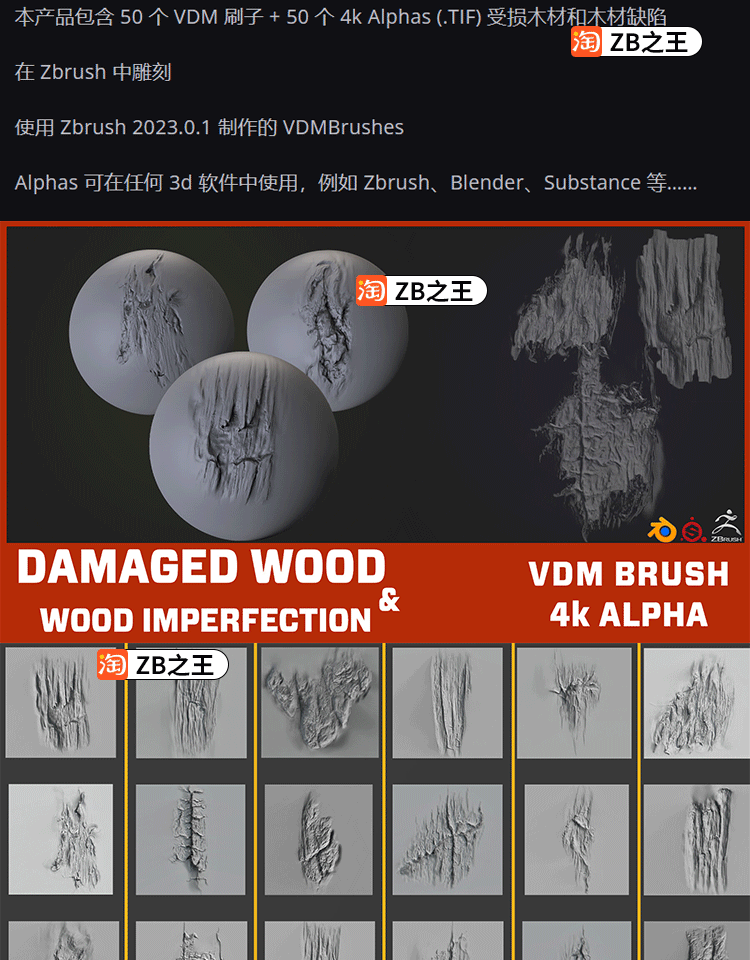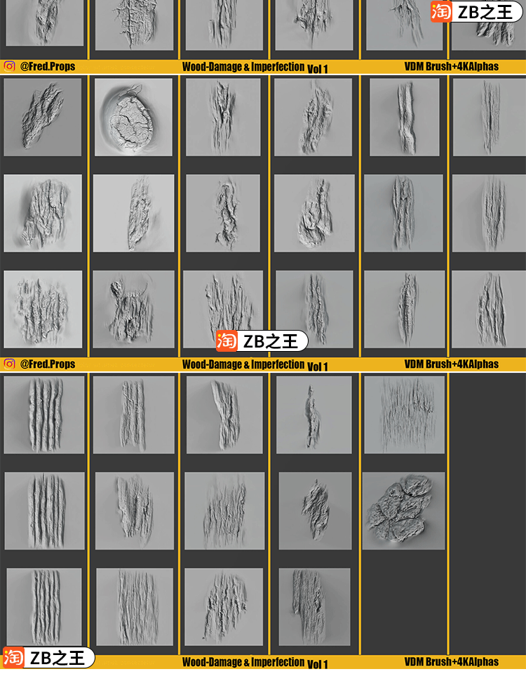 ZBrush笔刷ZBP素材50款木头裂纹木材缺陷损坏笔刷Alpha贴图纹理