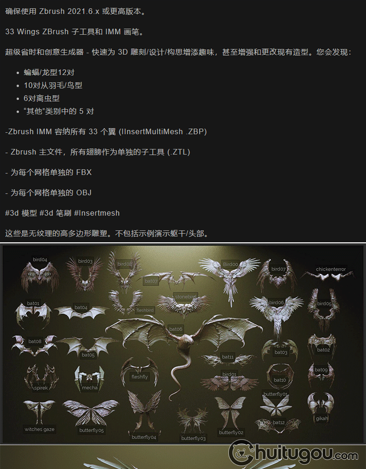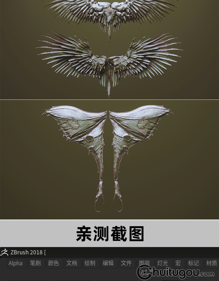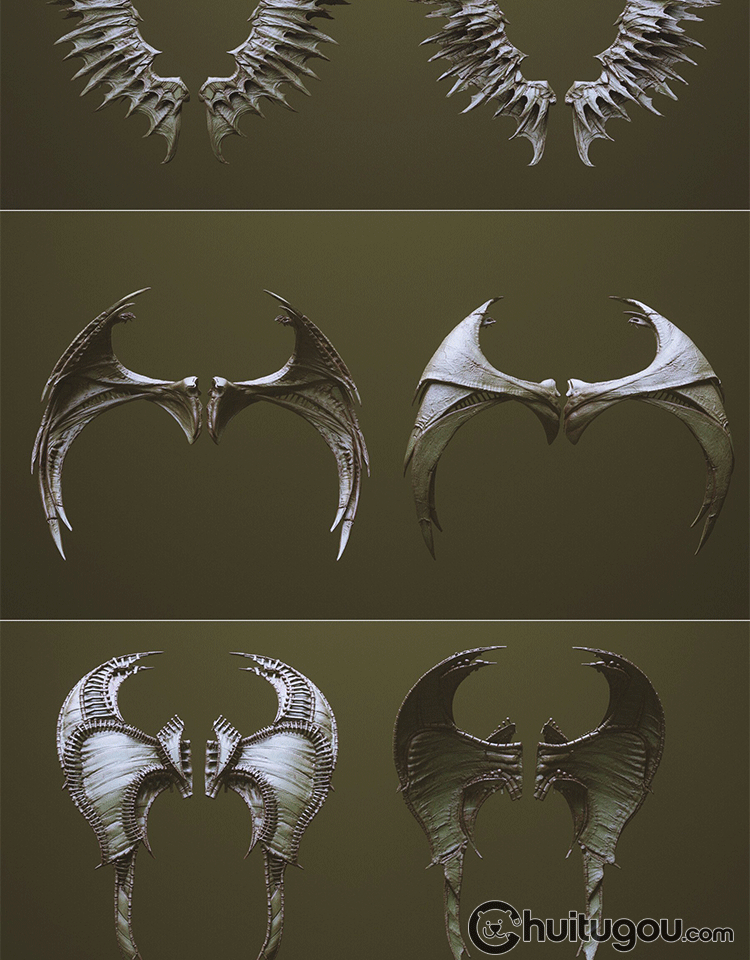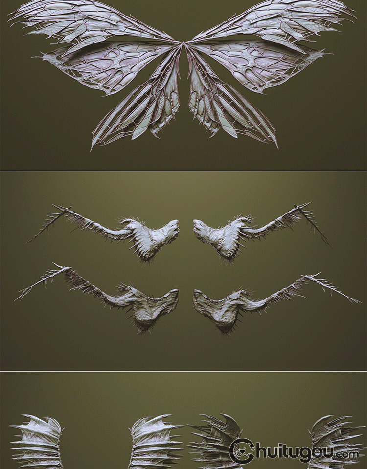 Zbrush科幻怪兽翅膀笔刷zbp生物肉翅IMM画笔ZB雕刻素材ztl格式obj