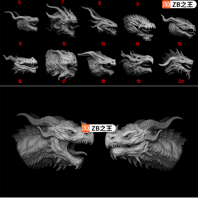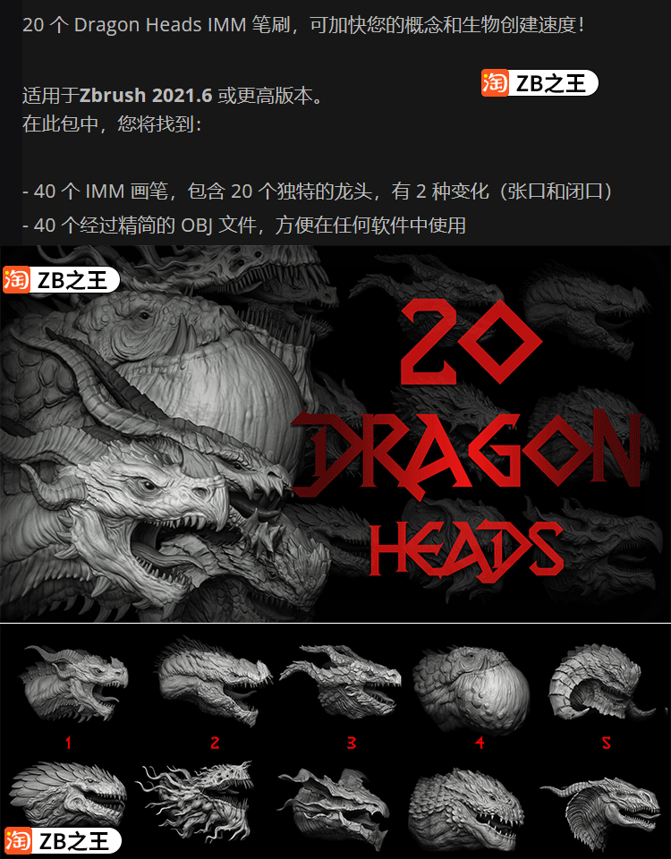 ZBrush笔刷ZB雕刻恐龙恶龙20款怪物生物头部龙头IMM笔刷zbp画笔