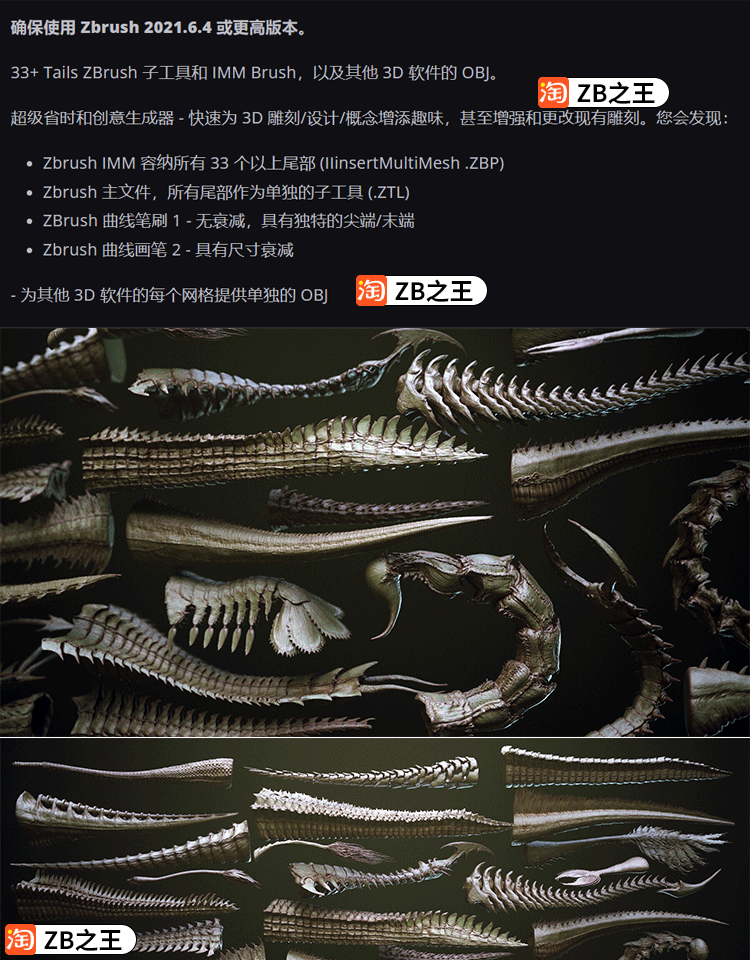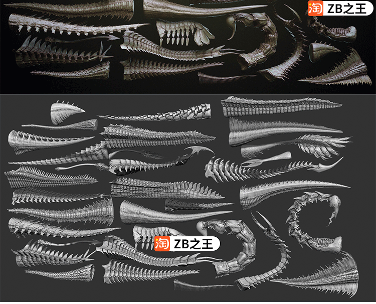 ZBrush笔刷ZB雕刻恐龙鳄鱼怪兽33款怪物尾部尾巴ZBP笔刷ZTL模型
