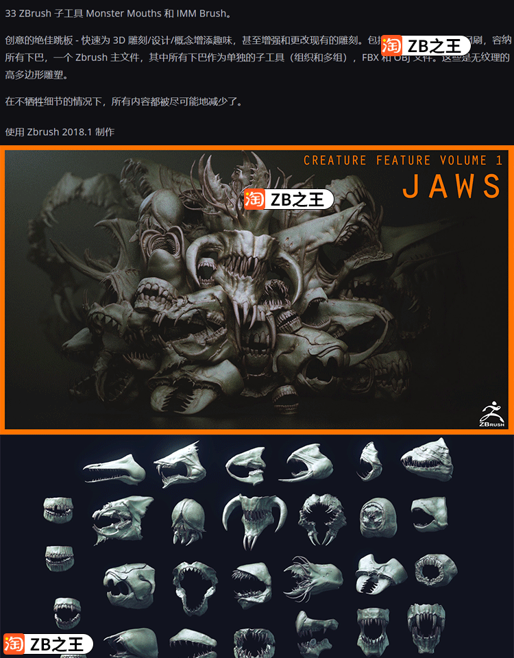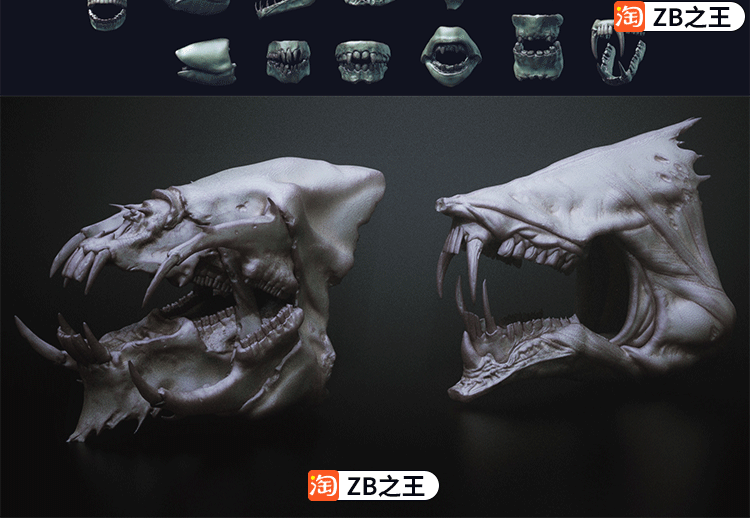 ZBrush笔刷ZB雕刻怪兽33款怪物嘴巴生物头骨IMM笔刷ZTL模型OBJ