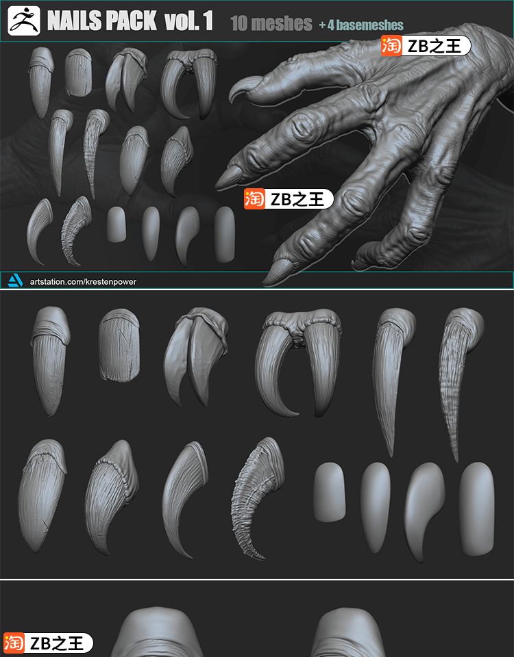 ZBrush素材ZB雕刻恶魔怪兽人14款生物指甲怪物爪子ZTL模型3D素材