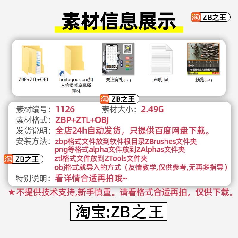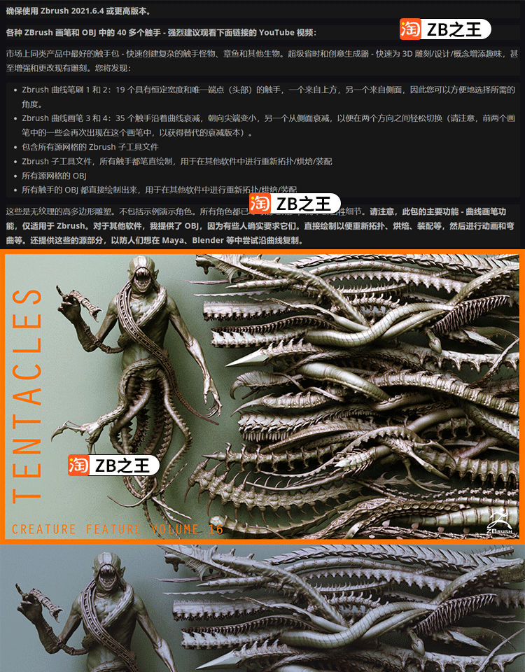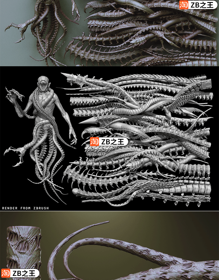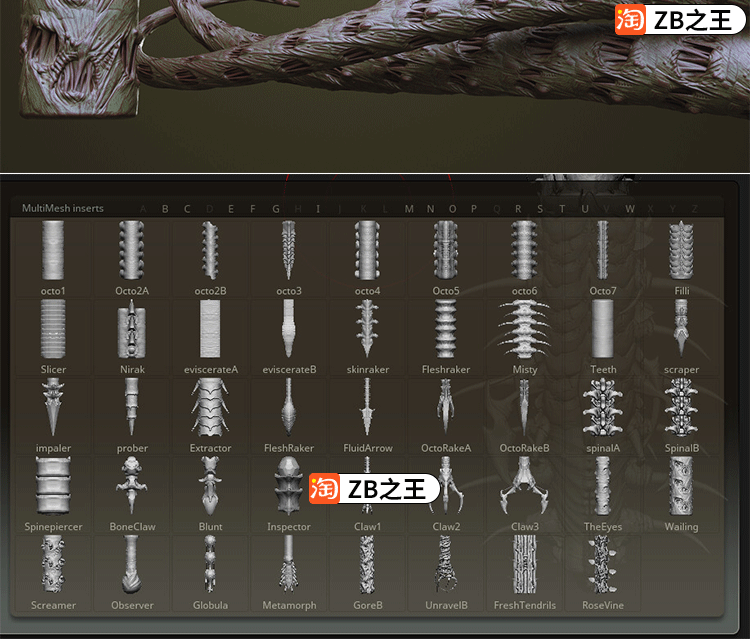 ZBrush笔刷100款怪物生物皮肤zbp附带FBX OBJ模型ZB建模雕刻素材