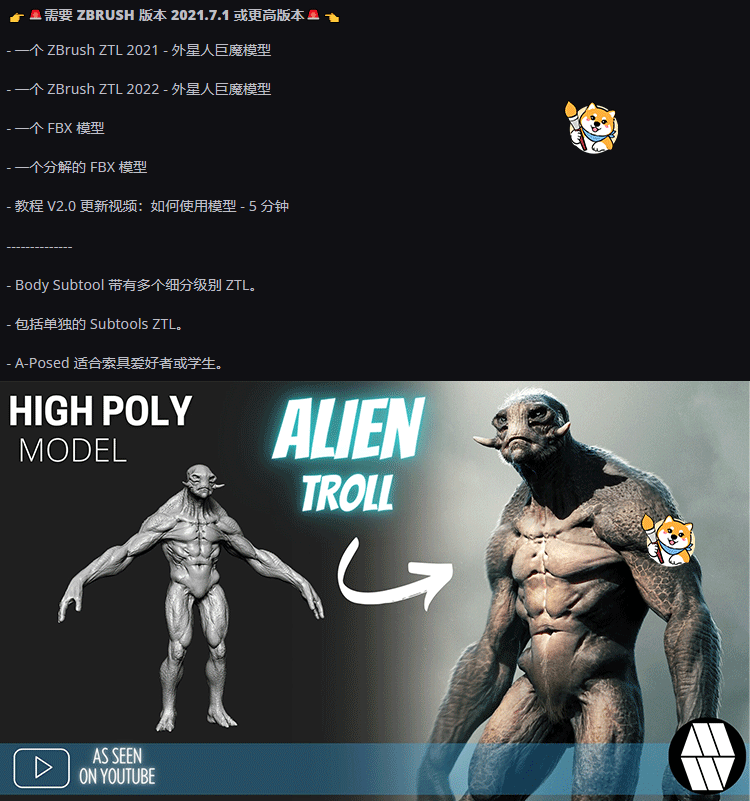 ZBrush素材1款恐龙人外星人ZTL工程科幻写实角色3D模型FBX文件