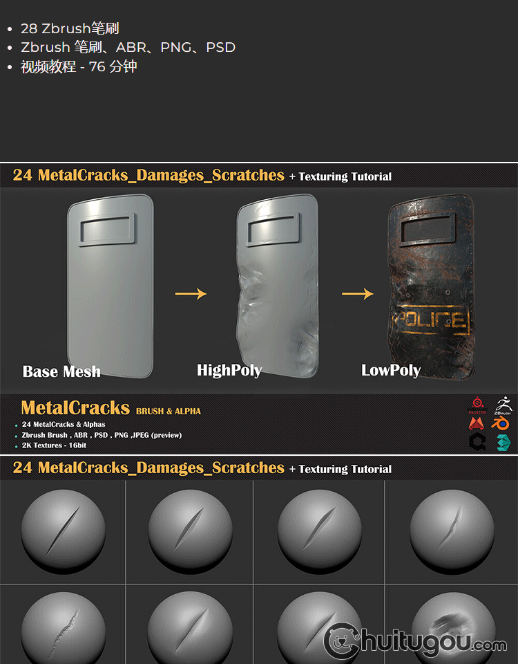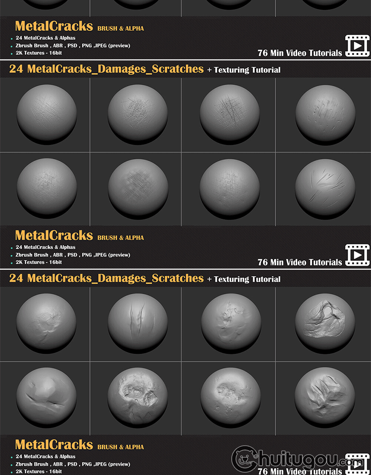 zbrush金属裂纹损坏划痕凹痕爪痕磨损zbp笔刷abr 阿尔法纹理贴图