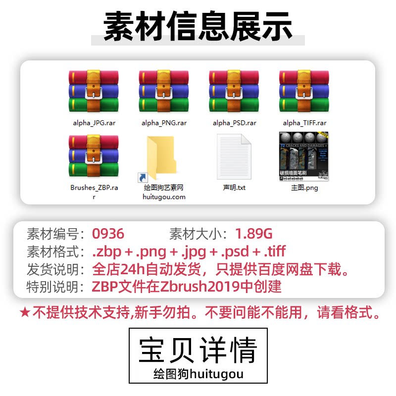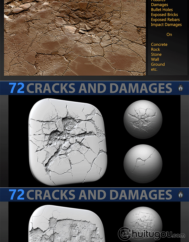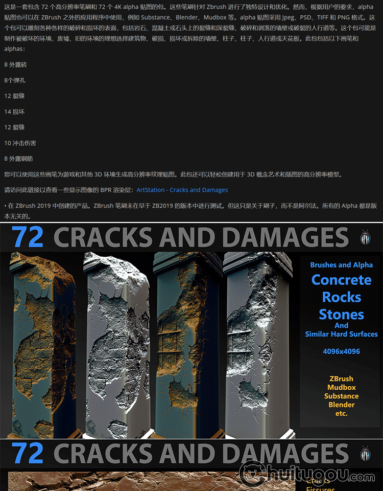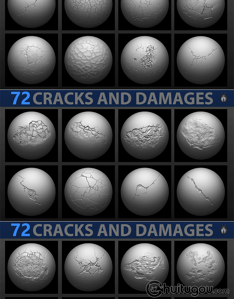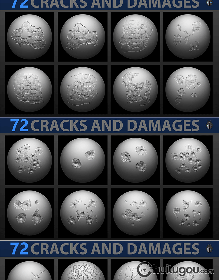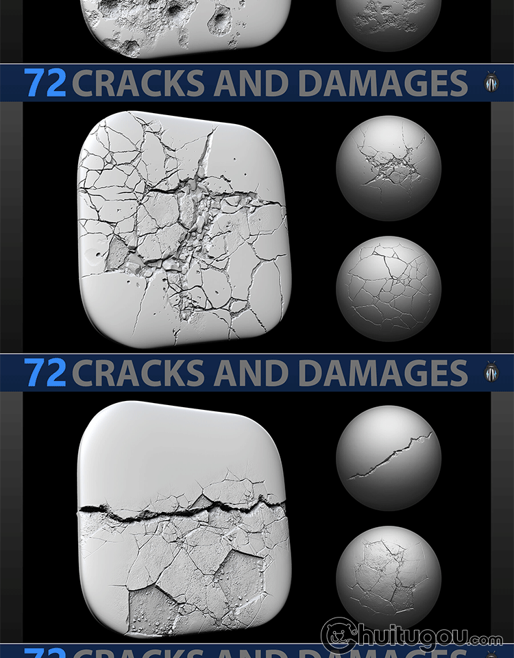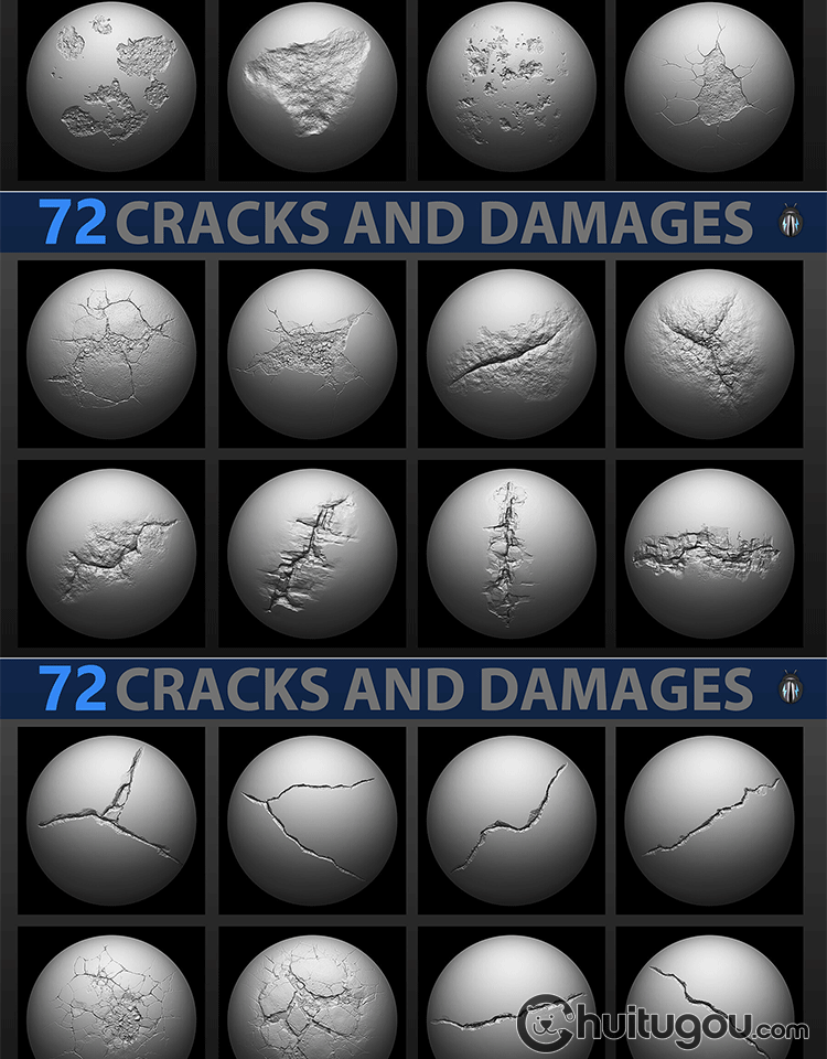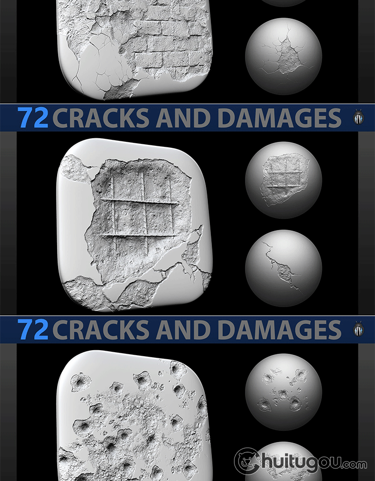 ZBrush素材100款墙壁地面损坏裂纹裂缝破损ZBP笔刷Alpha纹理贴图