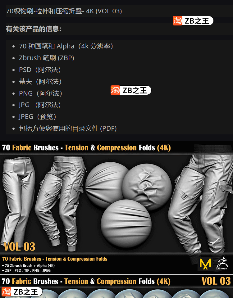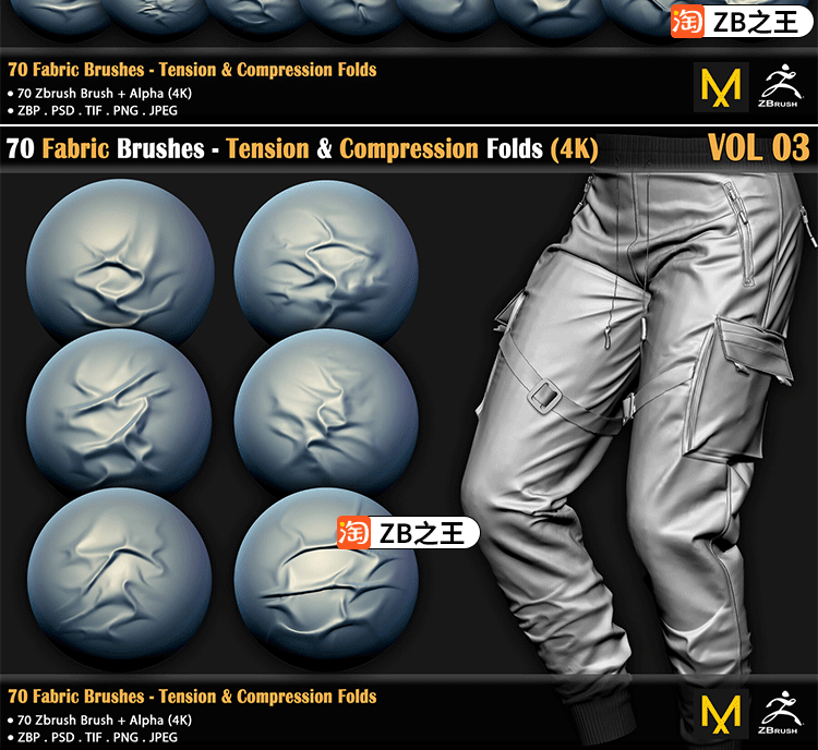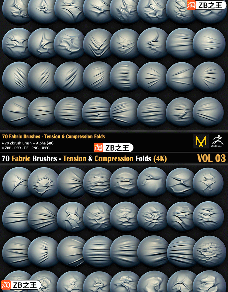 ZBrush雕刻服装褶皱70款衣服布料织物折痕压痕ZBP笔刷ZB纹理Alpha
