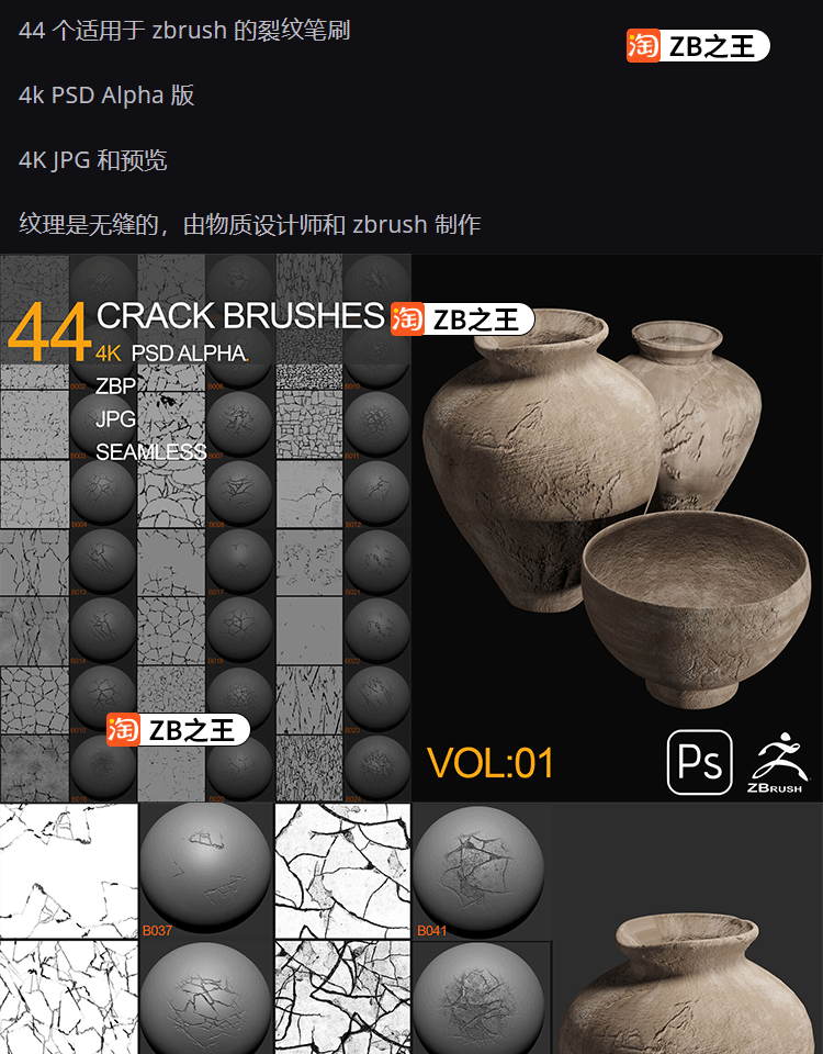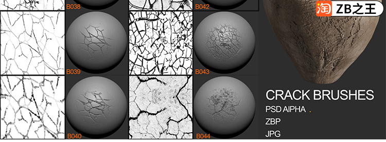ZBrush笔刷ZBP素材44款陶罐表面裂纹龟裂Alpha纹理贴图PSD格式JPG