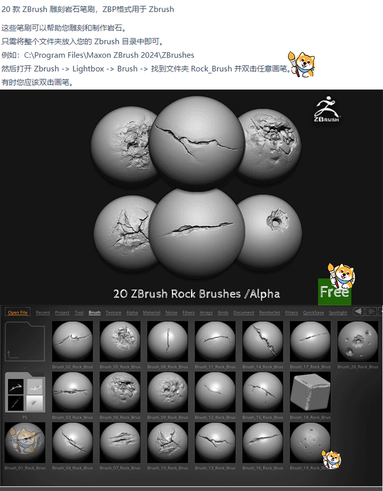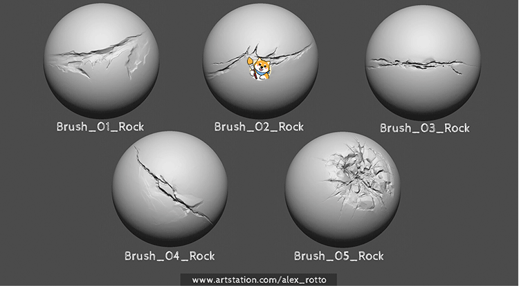 ZBrush笔刷60款石头岩石裂纹裂痕细节ZBP笔刷带Alpha纹理ZB素材