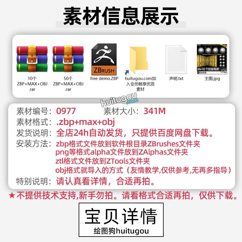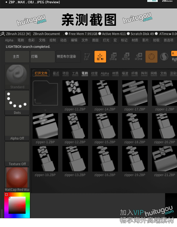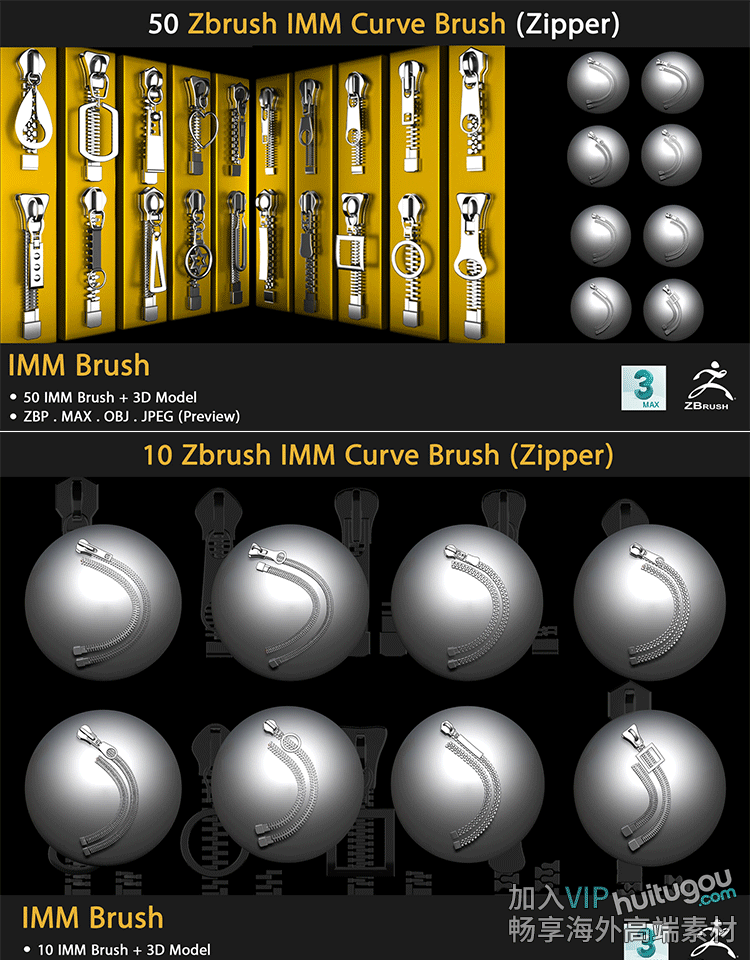 ZBrush素材120款拉链ZBP笔刷IMM曲线刷带OBJ模型3D建模ZB雕刻素材