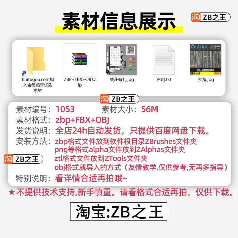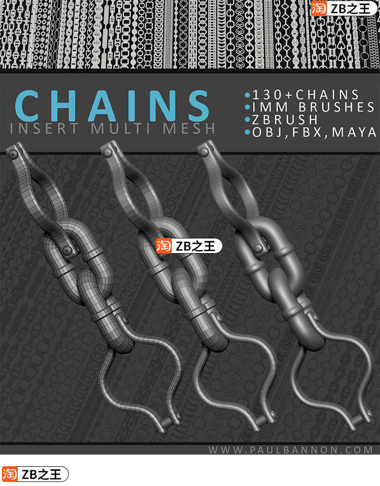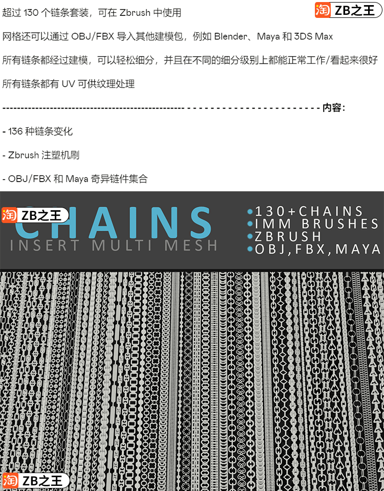 ZBrush素材链条链子ZBP格式笔刷ZB建模雕刻IMM插入笔刷FBX模型OBJ