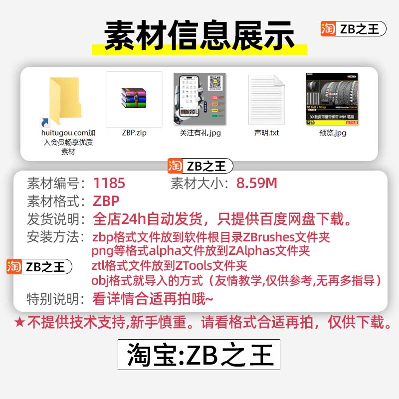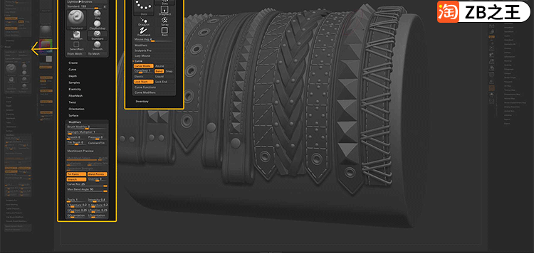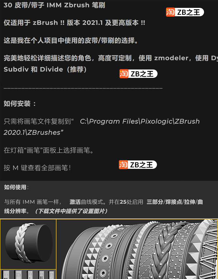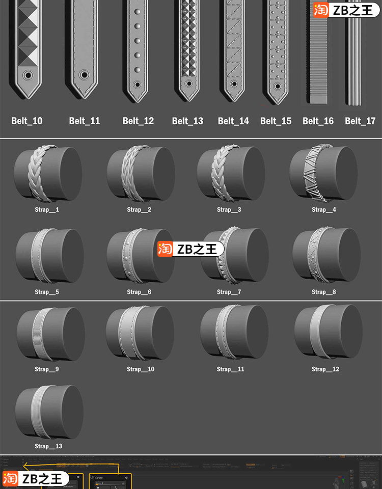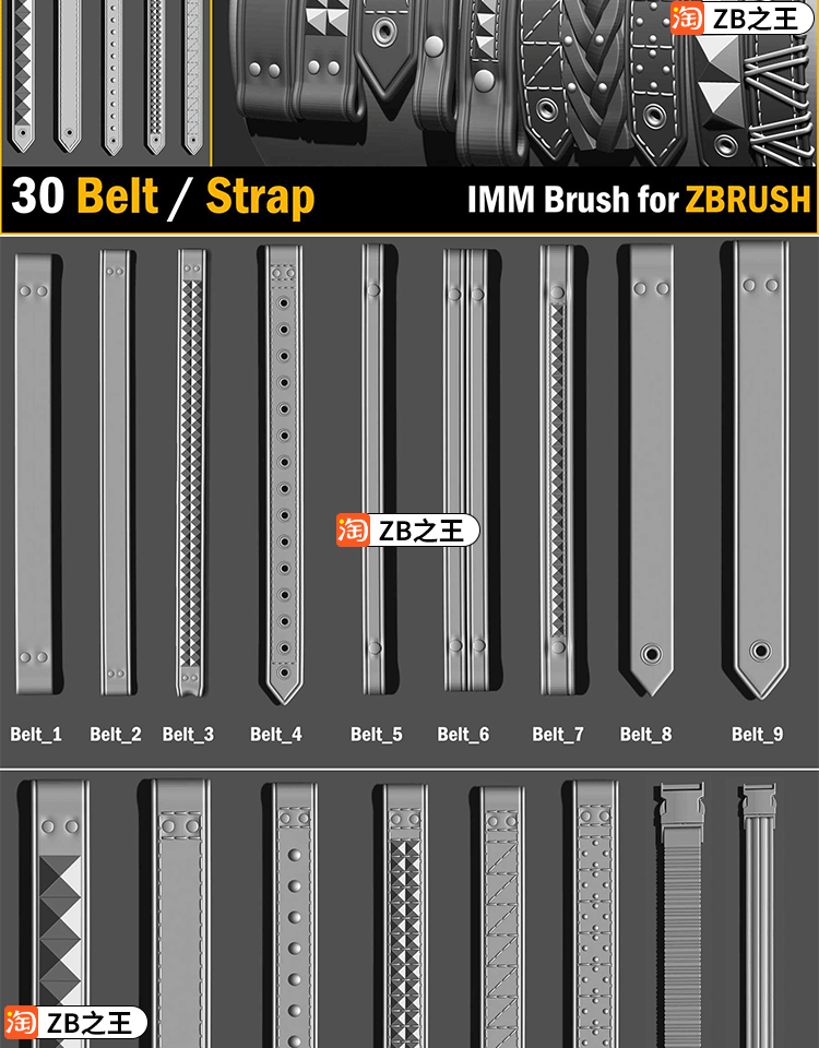 ZBrush笔刷30款皮带腰带绑带项圈IMM笔刷3D建模雕刻ZB素材