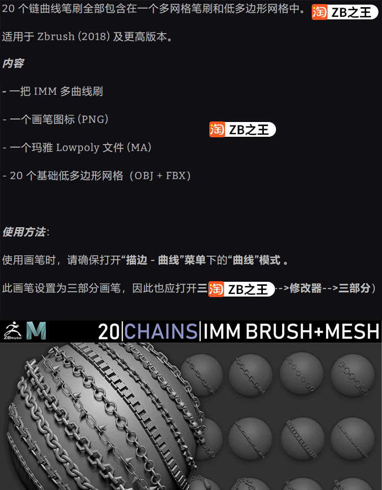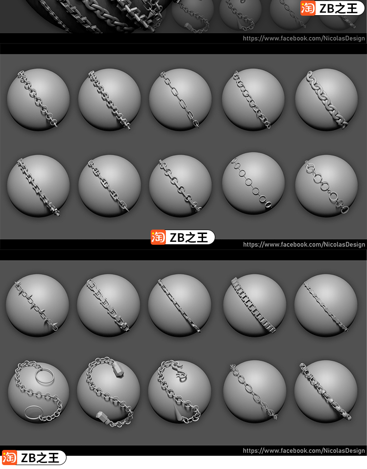 ZBrush笔刷20款链子曲线IMM笔刷OBJ模型ZB建模雕刻铁链手链项链
