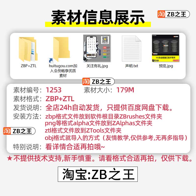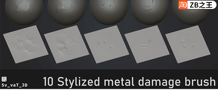 ZBrush素材10款金属捶打锤印撞击损坏ZBP笔刷带ZTL工程文件ZB雕刻