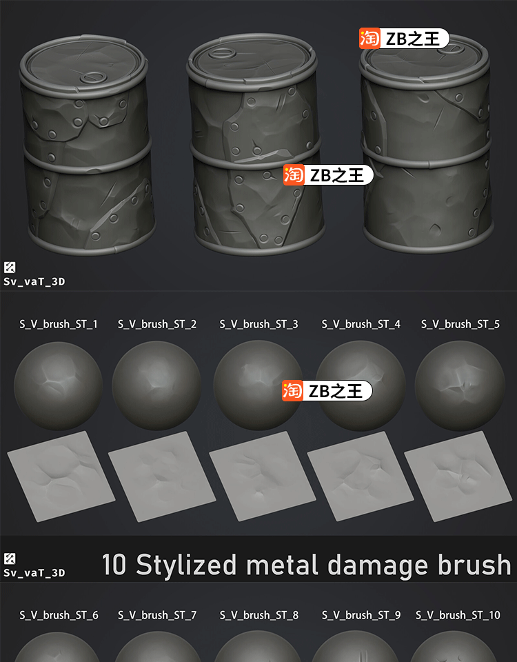 ZBrush笔刷素材10款金属锤纹凹凸补丁做旧ZBP笔刷ZB铁质水桶雕刻