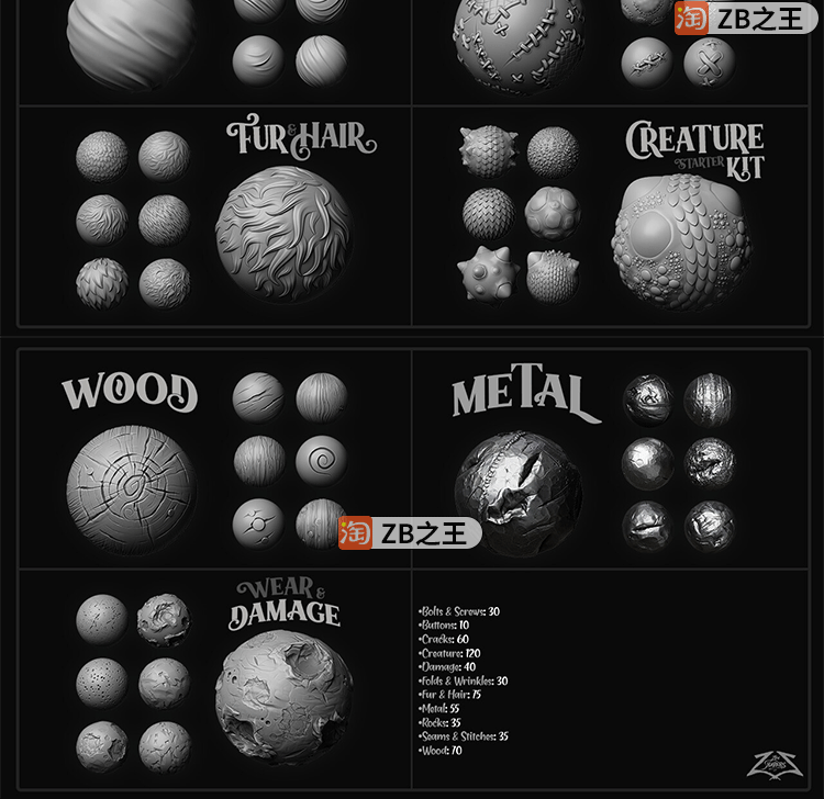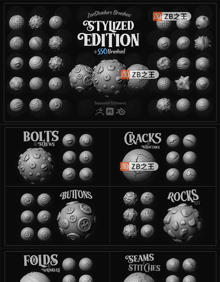 ZBrush素材550+风格化alpha画笔阿尔法笔刷合集ZB雕刻TIF置换贴图