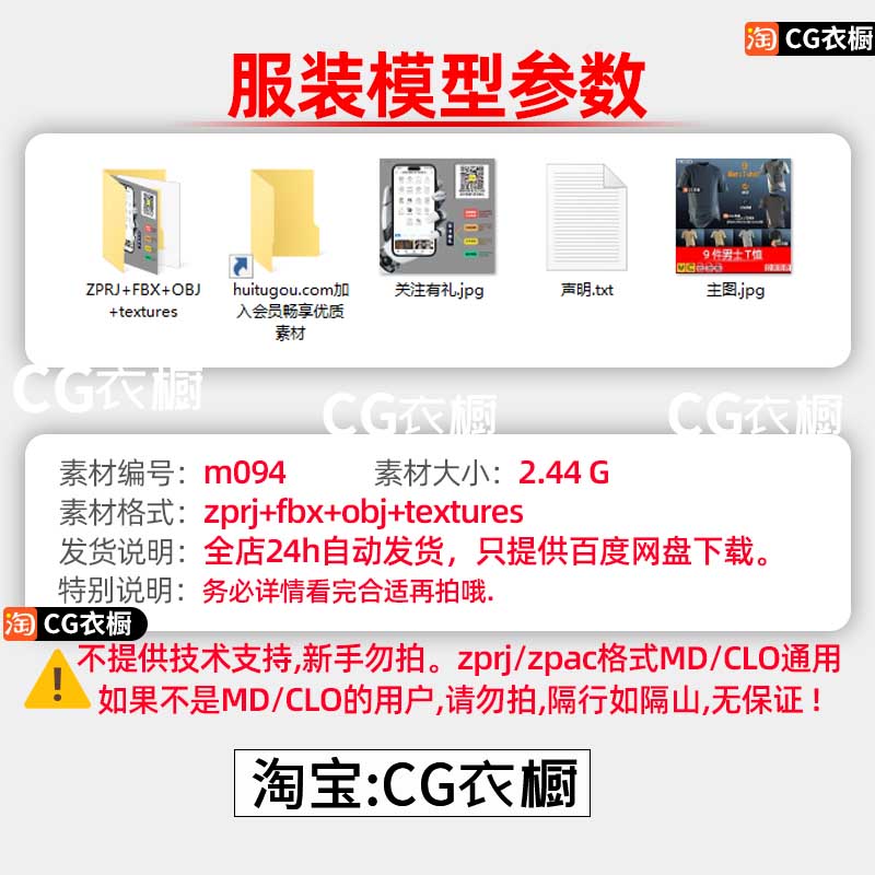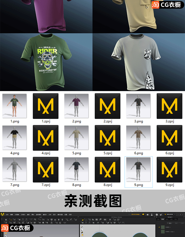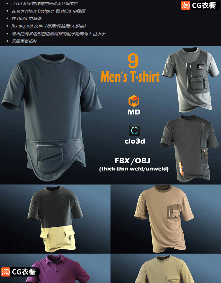 CLO3D/MD模型素材9件男士T 恤现代时尚风格衣服纸样ZPRJ工程文件