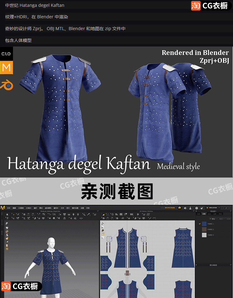 MD衣服CLO3D模型中世纪骑士束腰外套3D纸样ZPRJ工程源文件素材OBJ