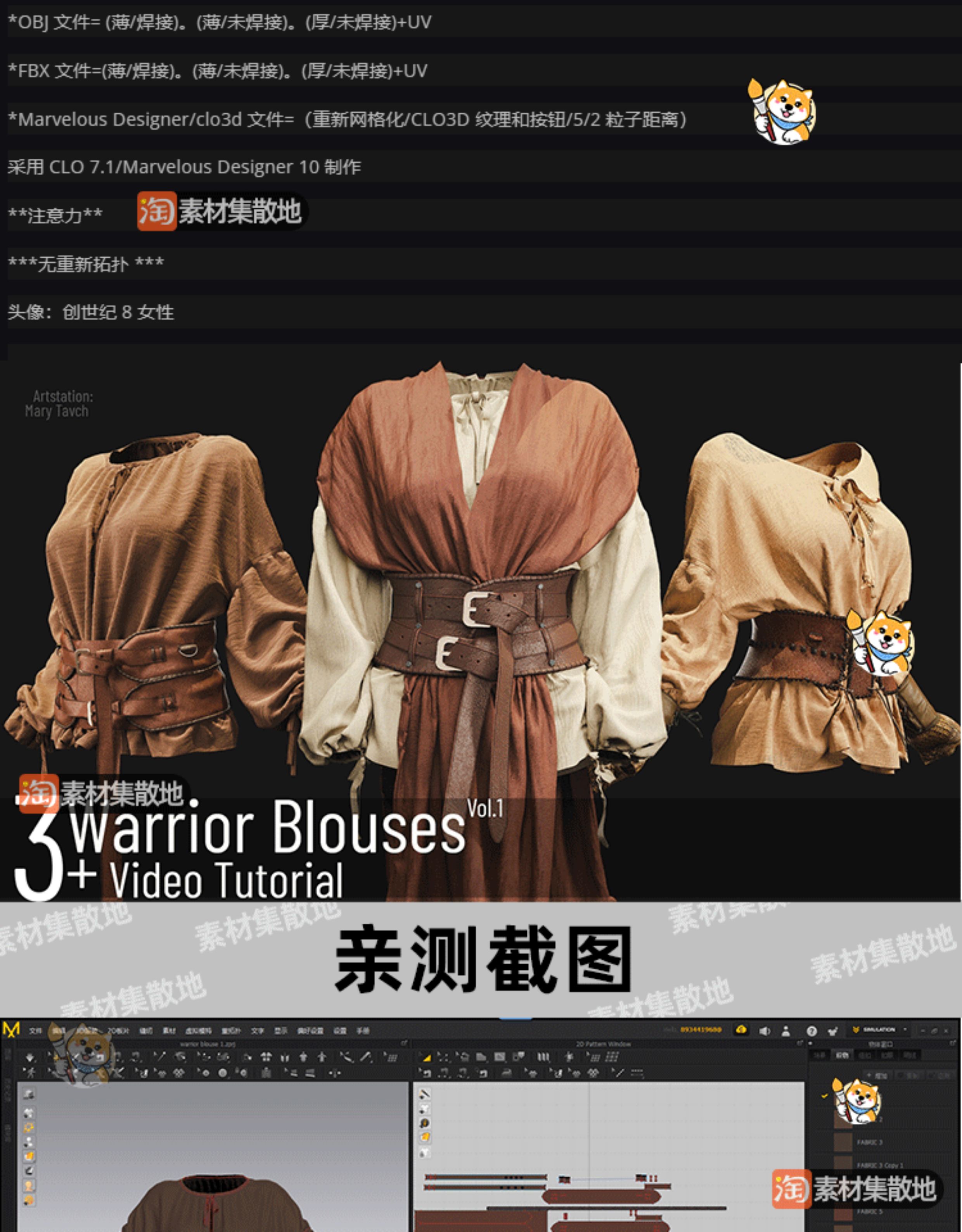 MD中世纪外套上衣3D服装CLO女性衬衫腰带套装ZPRJ模型打版源文件