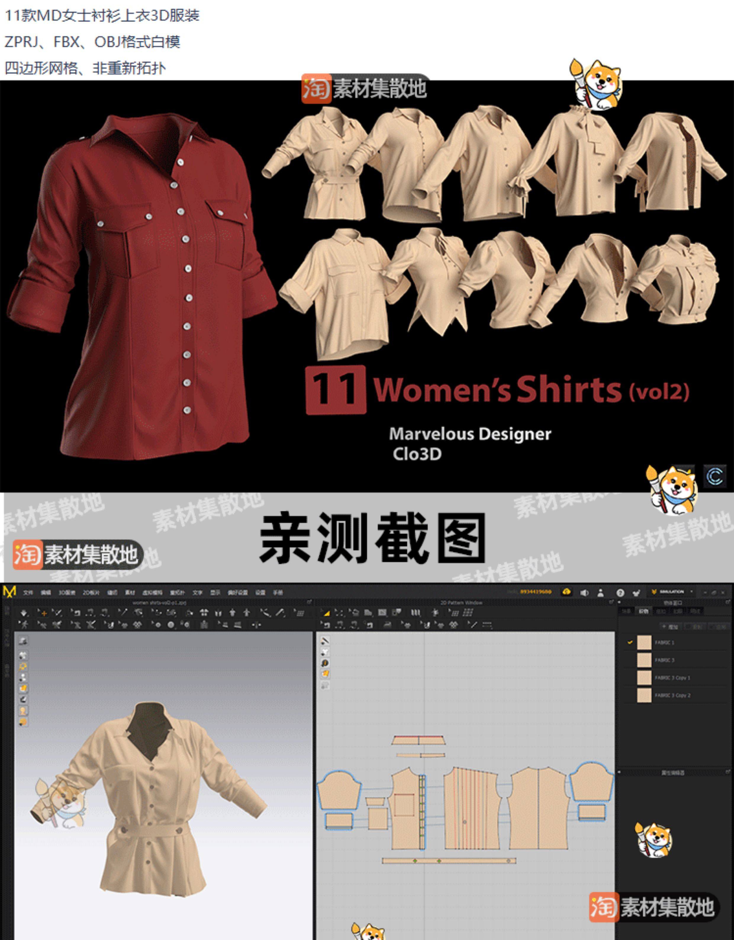 11款女士T恤衬衫上衣clo3d服装长袖衬衣套装ZPRJ模型打版纸样文件