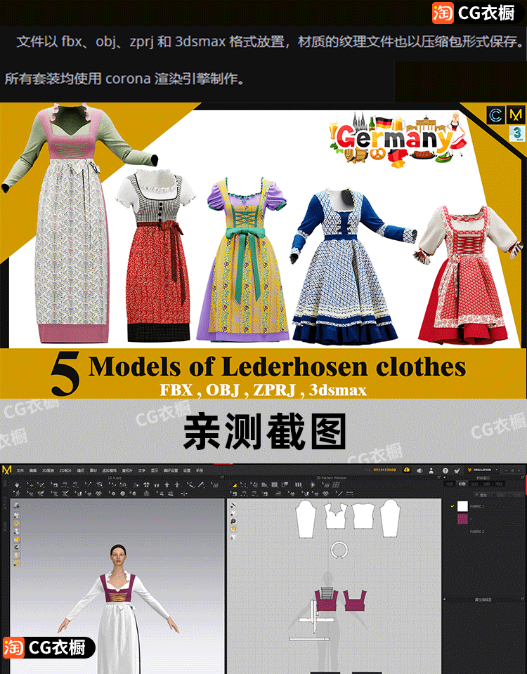 MD模型CLO3D衣服素材5款德国传统服饰女装民族风连衣裙子ZPRJ纸样