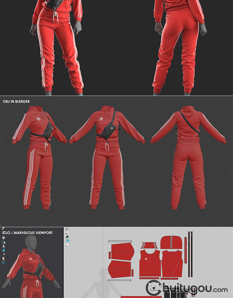 MD Clo3D女性运动装卫衣挎包套装zprj服装项目文件3D模型 附教程