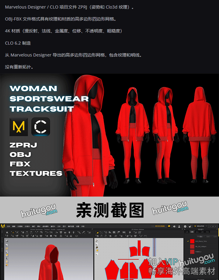 MD衣服素材CLO女士连帽运动服卫衣紧身裤ZPRJ服装打版纸样工程OBJ