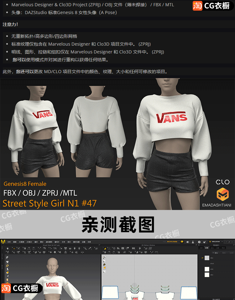CLO服装模型MD街头风格露脐女装小短裤街头穿搭衣服ZPRJ工程纸样